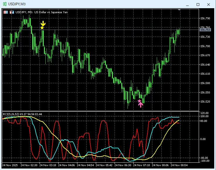 【RCIを極めてトレンド転換をとらえる!!】本日のドル円チャート mBDSRのサイン 3分足