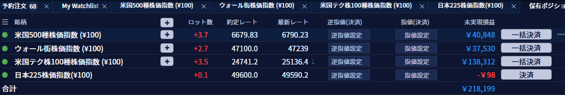 取引途中経過2025/11/26 含み益218,199円 株価指数(S&P500 ダウ平均 NADAQ100 日経225)