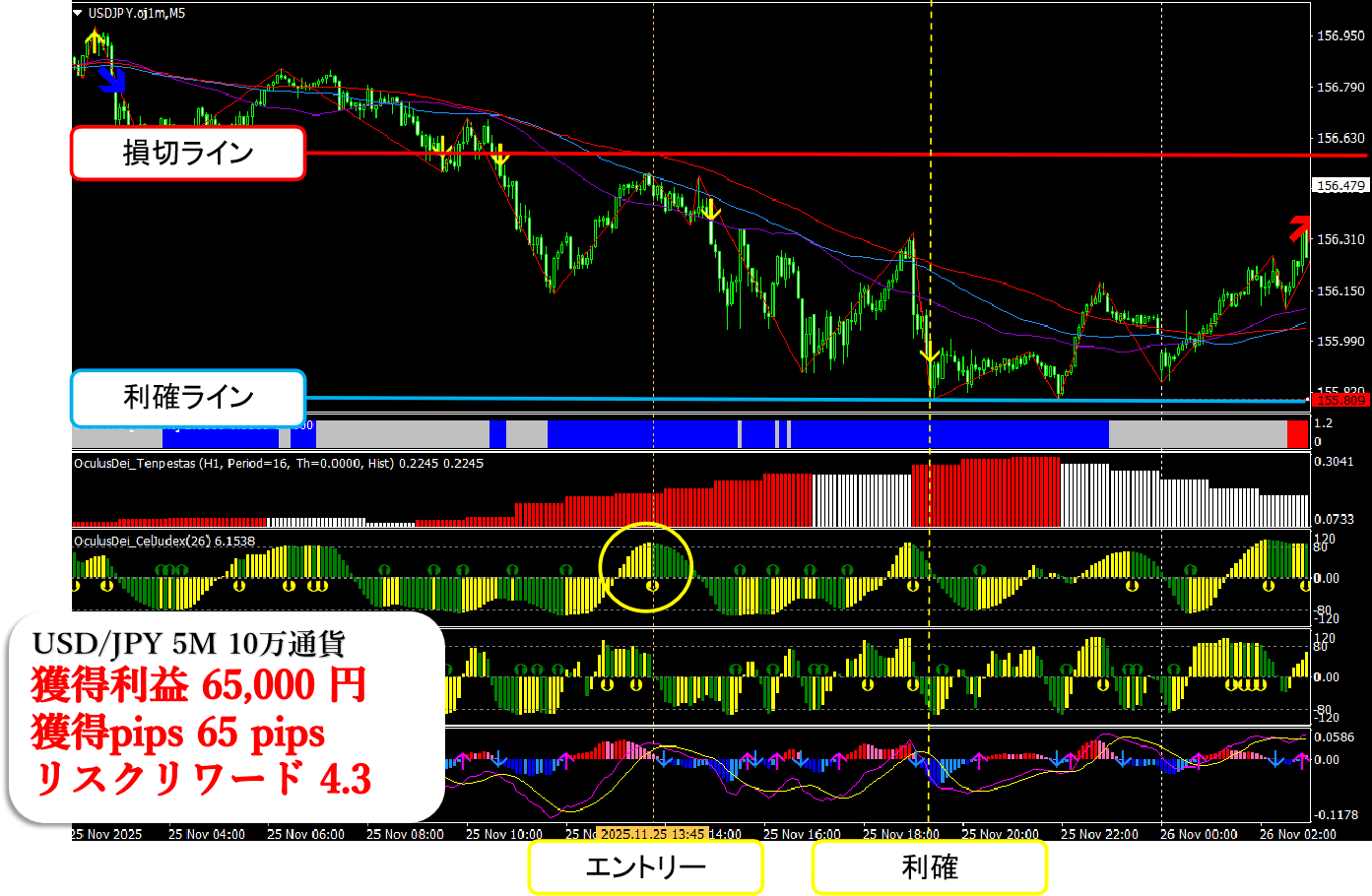 前回の記事でも紹介したように、11月25日のドル円はファンダメンタルとテクニカルの両面から見て、戻り売りが成立しやすい地合いでした。今回は天眼インジケーターと Order Book の組み合わせを使い、天井付近 → 底付近まで約65pipsを獲得できたトレードです。
