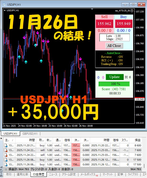 【前日の結果】USDJPY H1 / M5 『ATS-25』11月26日