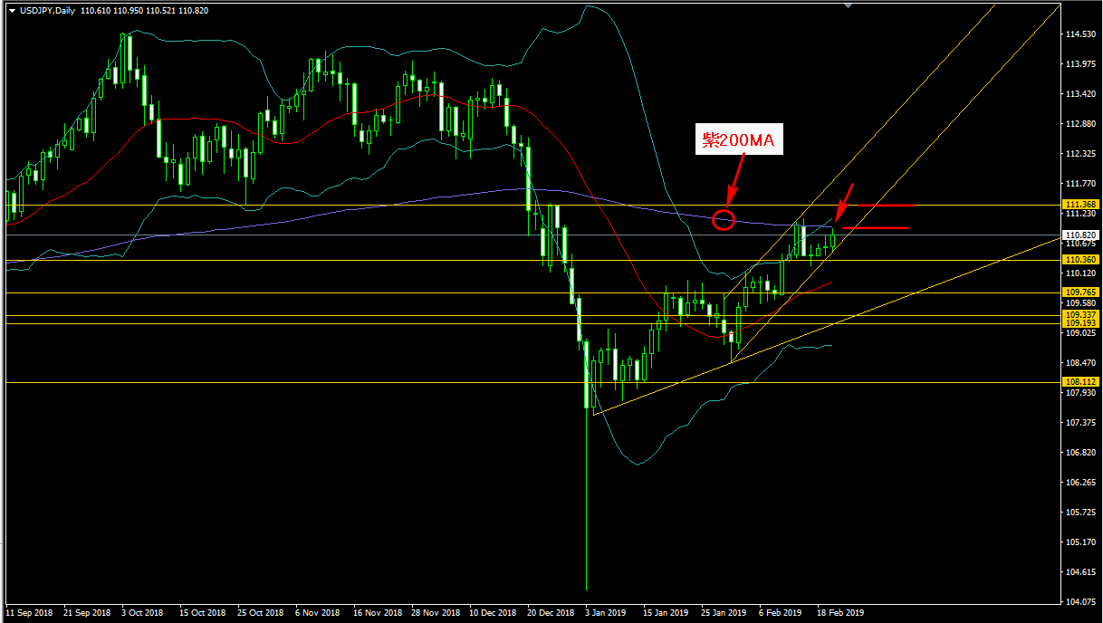 ドル円の日足チャートから見てみます。ドル円日足では、トレンドラインの角度がきつくなってきており現状では機関投資家も注目する唯一強力な壁として機能するとされる200MAまで再び到達し頭を抑えられヒゲを付けている状態です。この200MAを下から上抜けするかがポイントですが、それを越えたとしてもその上には強めの壁と思われるドル円111.368円の壁がある為そこでまた止められる可能性があり上値が重い状況と予想されます。