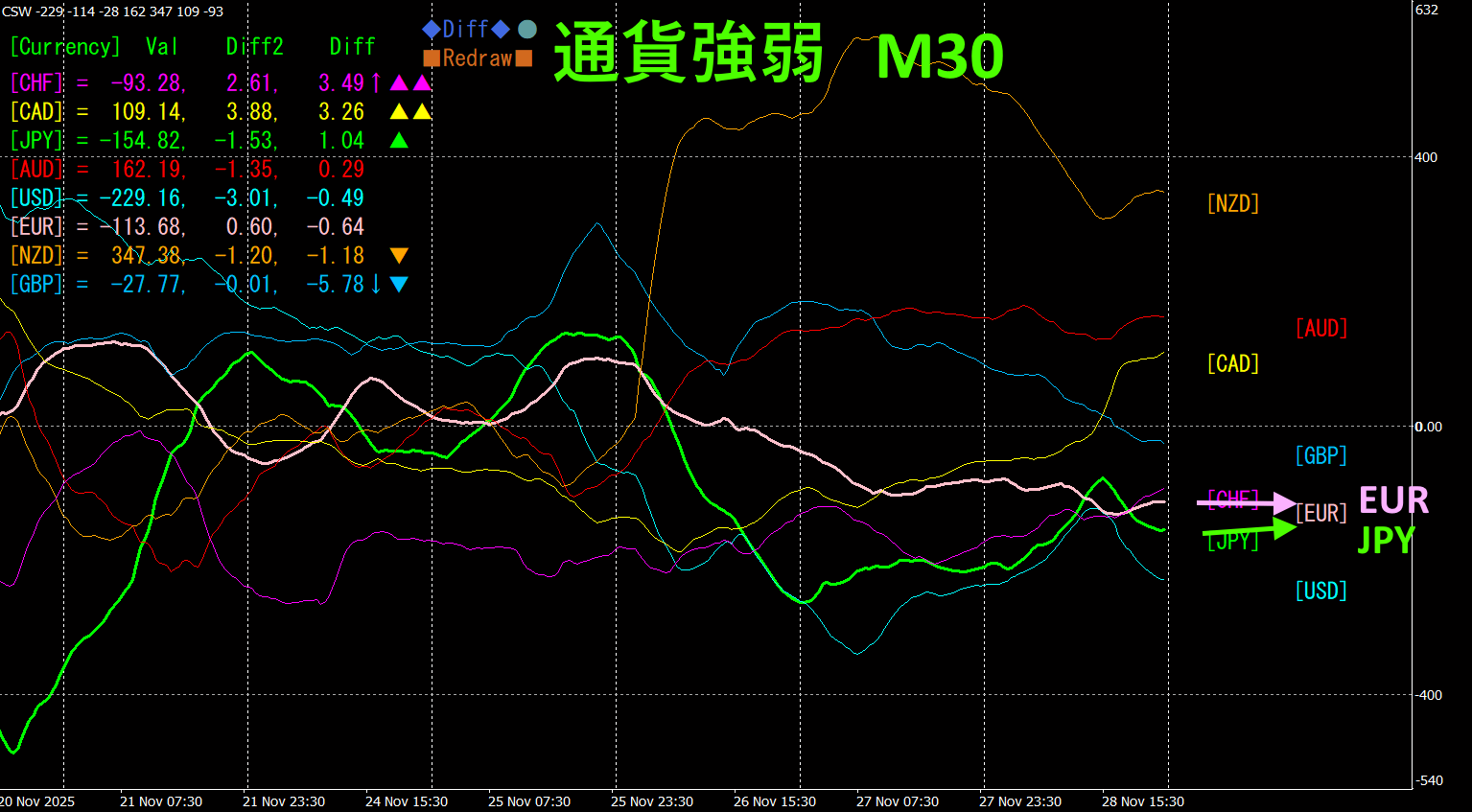 ピンク色がEUR、緑色がJPYです。先週のEURJPYの上昇は、通貨JPYが弱くなったことが原因であることが読み取れます。今後の方向として、EURは下向きに、JPYはしっかり上向きになっているので、EURJPYは下降状態に推移するものと考えられます。
