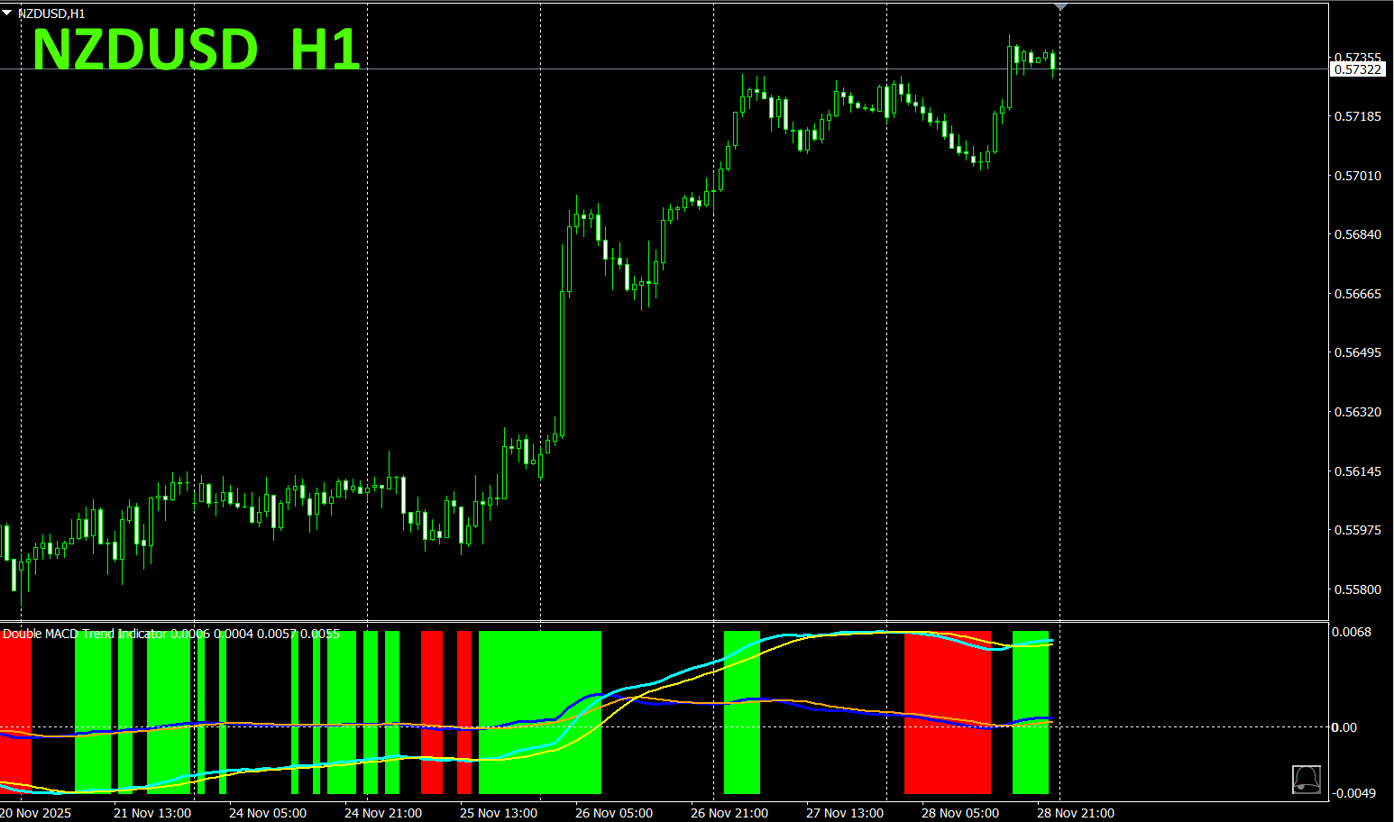 「Dual_MACD_Trend_Indicator」では、緑色のゾーンなら買い、赤色のゾーンなら売り、それ以外ではトレードしないという単純なルールに従うだけです。