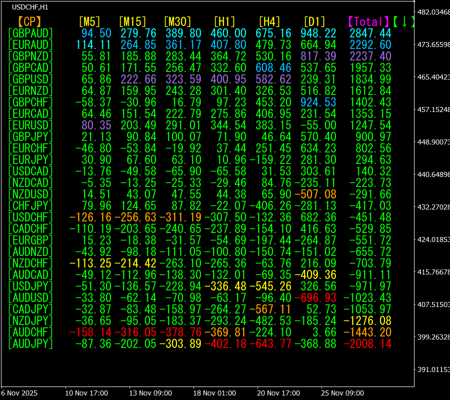[Total]数値の降順に並んでいます。一番上にあるGBPAUDは、全ての時間足で青色系の表示色になっています。Total数値が