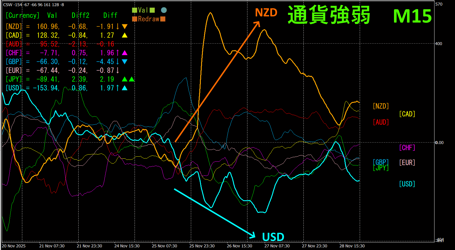 15分足の通貨強弱グラフを見ると、NZDとUSDが、見事な逆相関関係になっていることがわかります。NZDとUSDの関係は、NZD>USDで、NZDとUSDが拡散して広がっている部分だけに注目し、NZDUSDを買いでトレードすれば良いのです。 途中でグラフが波打っていますが、NZDとUSDのベクトルが広がっている間、ポジションを保持します。