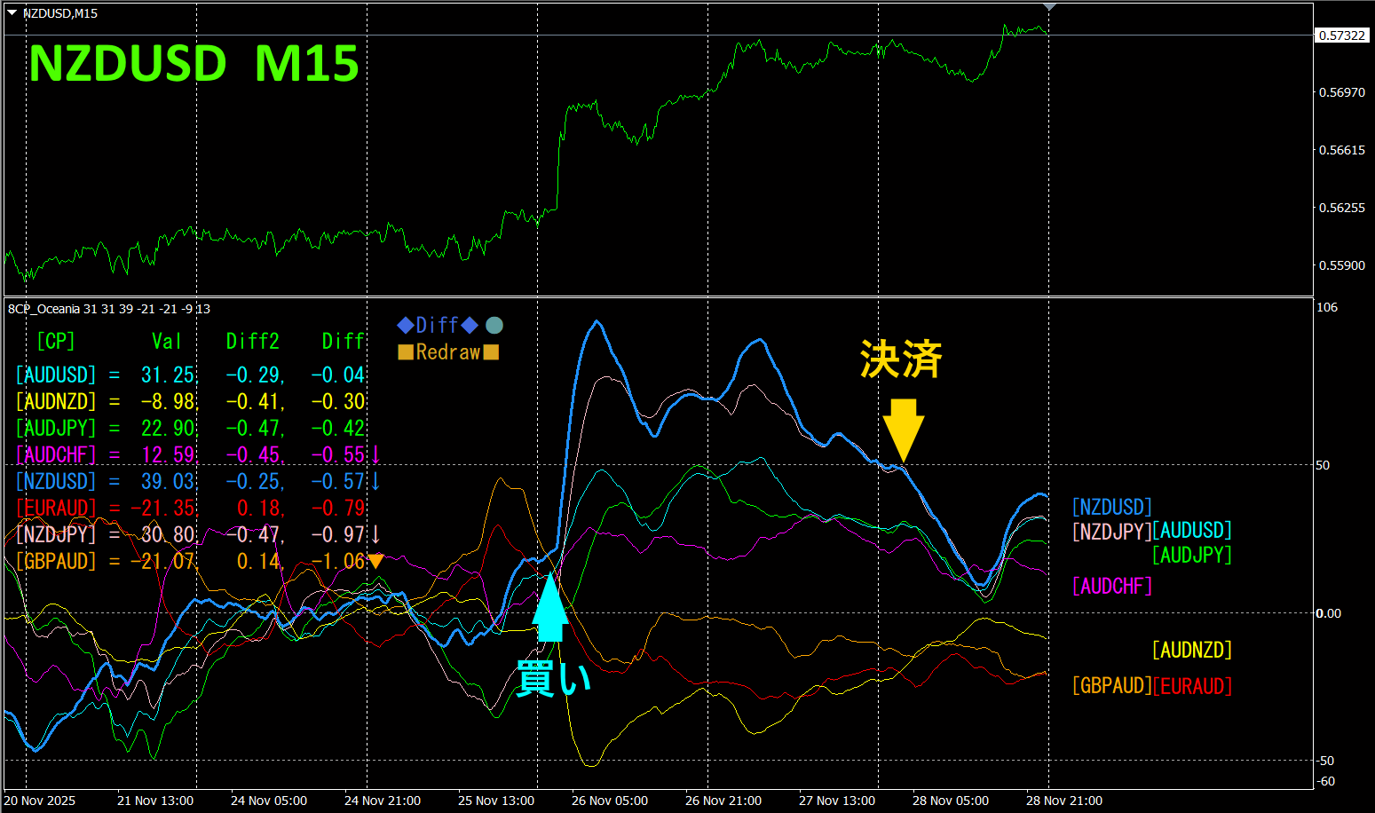 上半分は、NZDUSDの15分足チャートです。下半分は、「8CP見える化インジケータ」によるものです、青色太線のグラフがNZDUSDに相当します