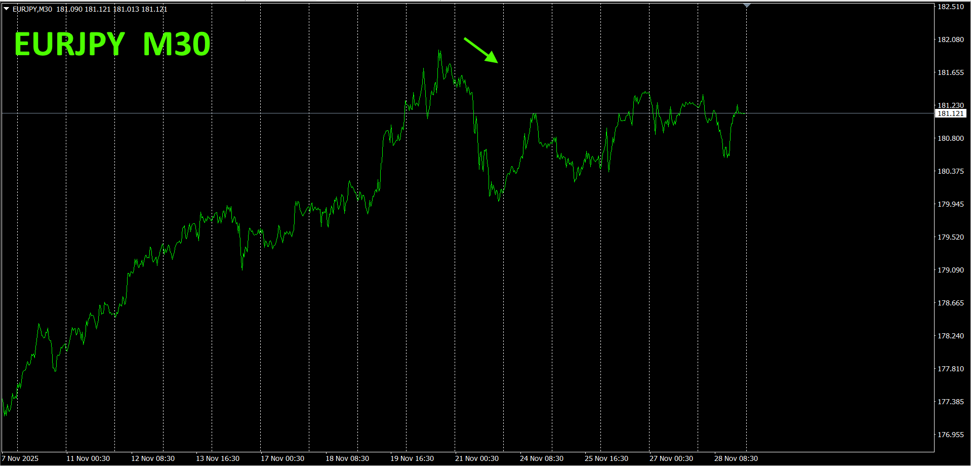 全体の流れを見るため、30分足チャートで直近約3週間分を描いています。