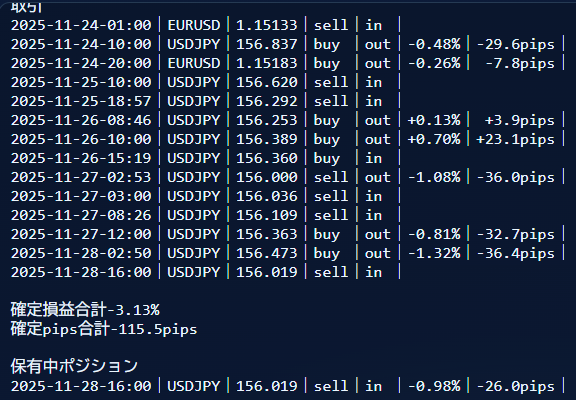 2025-11-28-02:50|USDJPY|156.473|buy |out|-1.32%|-36.4pips|