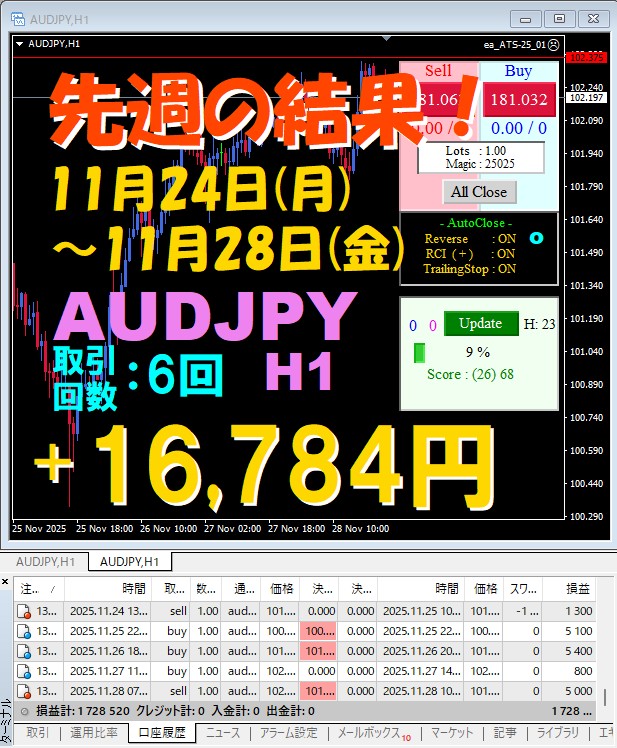 【先週の結果】AUDJPY H1 『ATS-25』11月24日(月)~11月28日(金)