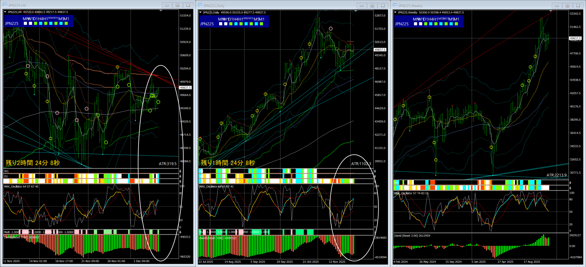 一方で、週足のMAXオシレーター、シンクロバンドは「中立」を示唆