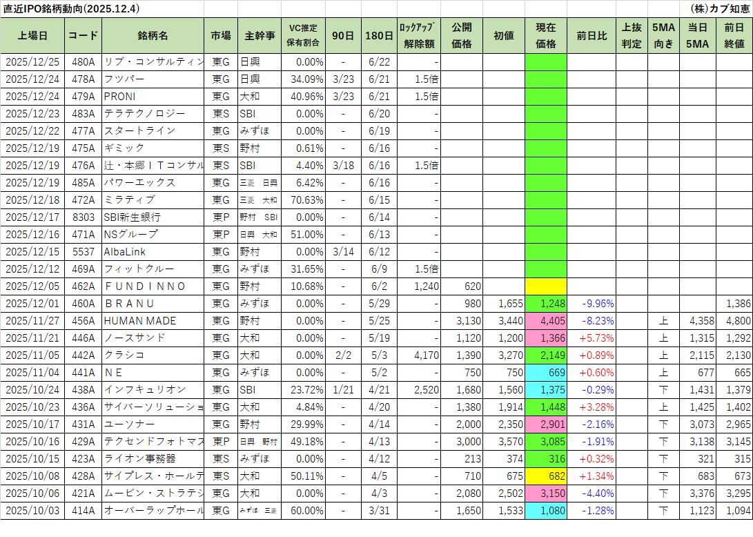 カブ知恵発 直近IPO銘柄動向(2025/12/4)