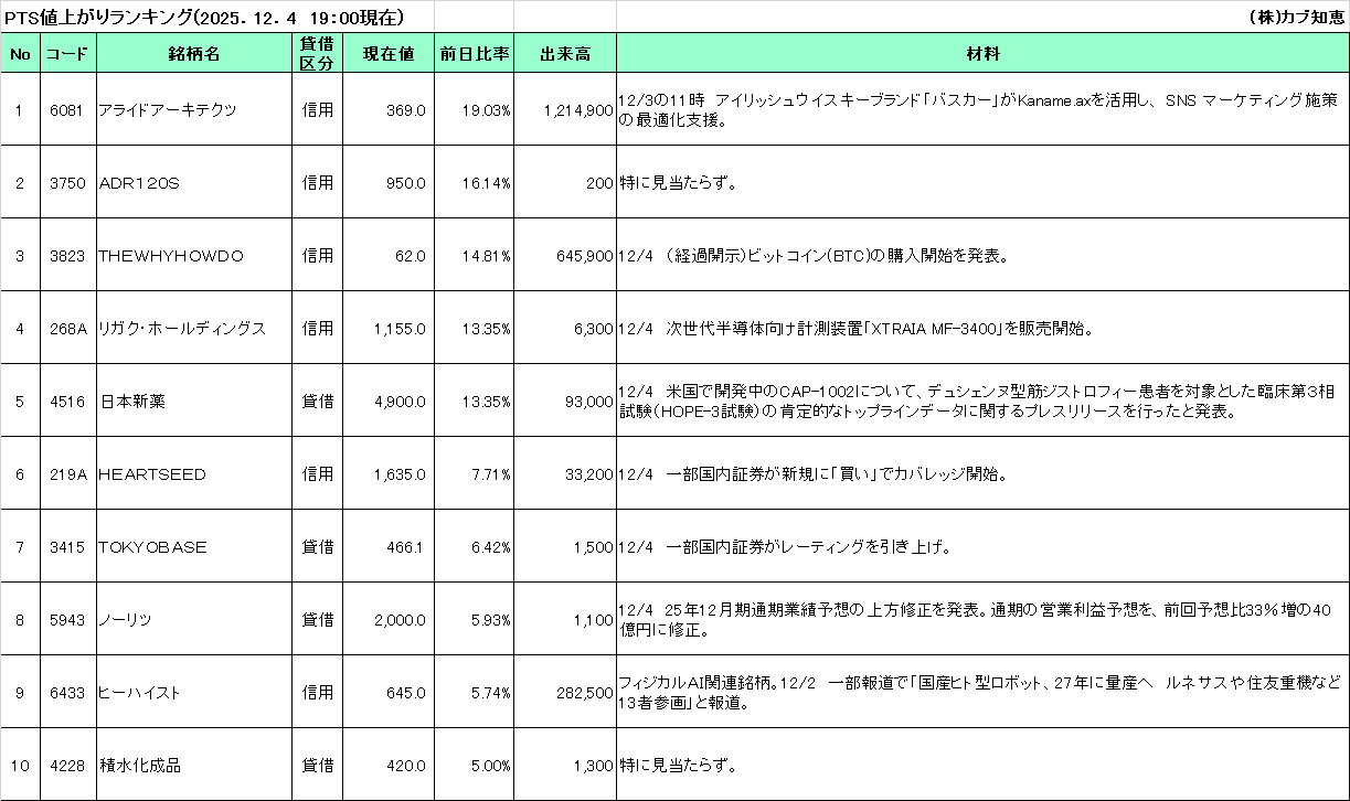 カブ知恵発 PTS値上がりTOP10(2025/12/4)