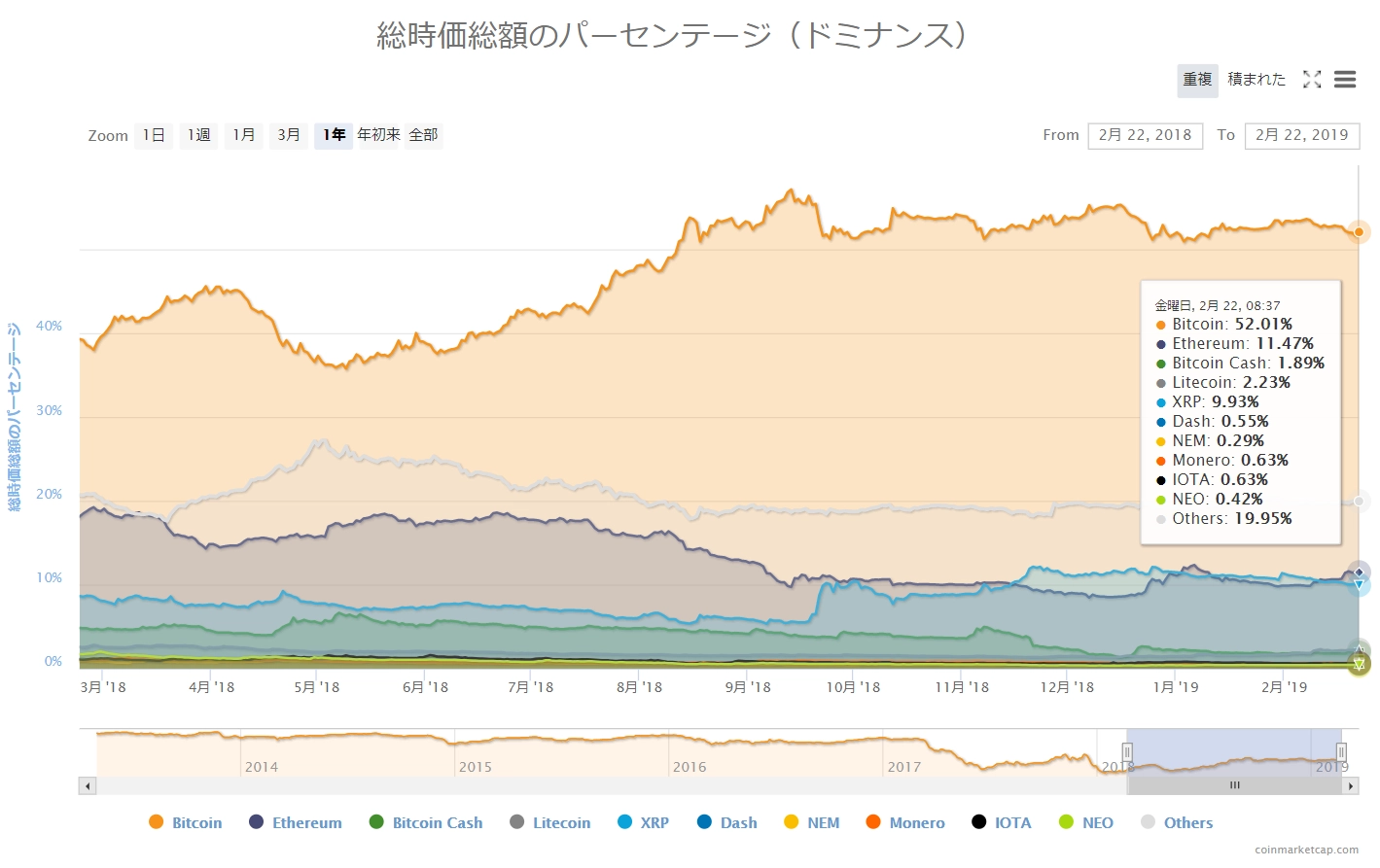 画像は2019年2月21日のキャプチャ。昨日は主要どころで1~6%の上昇をしていました。今日は反転して、全面的に「赤」の相場環境です。主要どころでは1~5%の下落です。