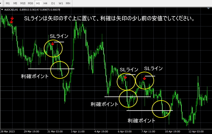 SLラインは矢印のすぐ上に置いて、利確は矢印の少し前の安値でしてください。少し前の安値がない場合は、SLの幅の2倍以上の幅を利確ポイントにしてください。