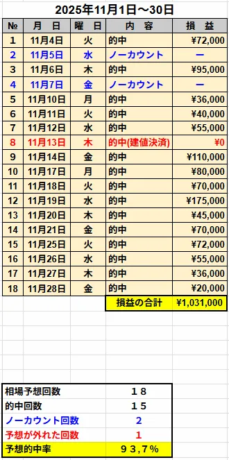 2025年11月の的中率と利益は以下