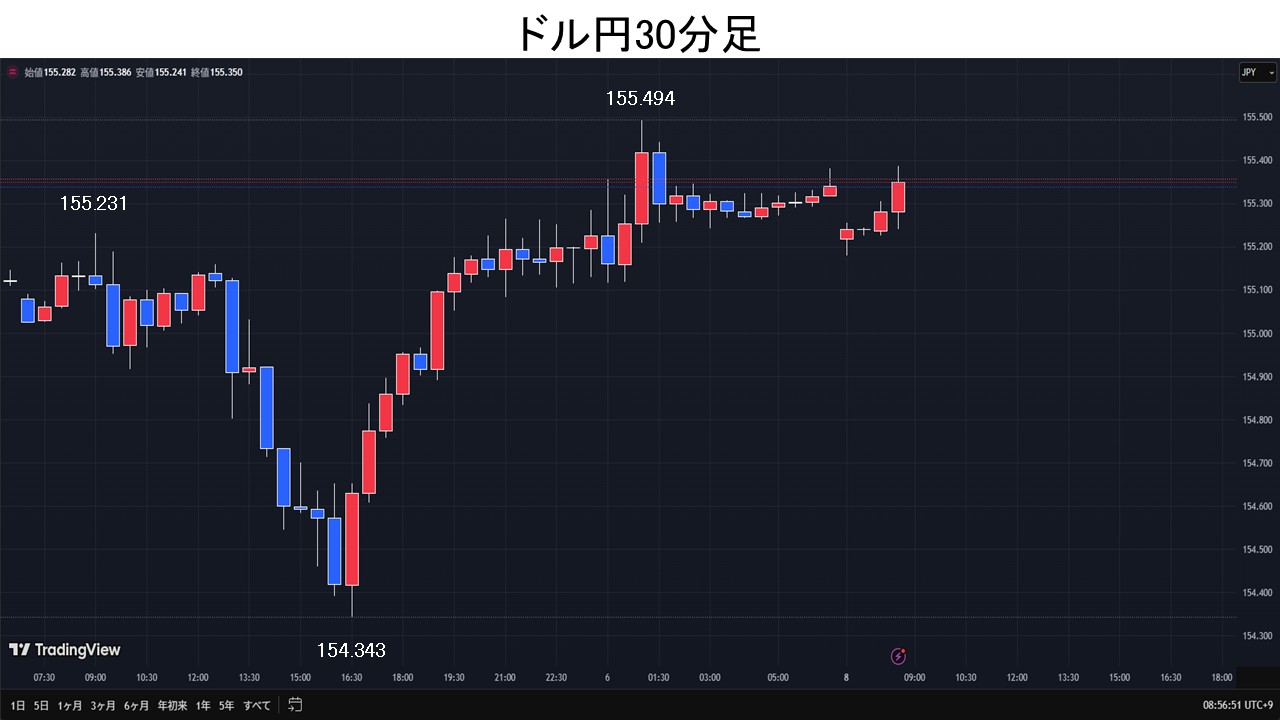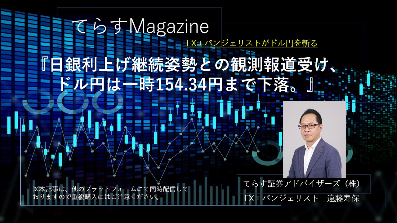 日銀利上げ継続姿勢との観測報道受け、ドル円は一時154.34円まで下落。