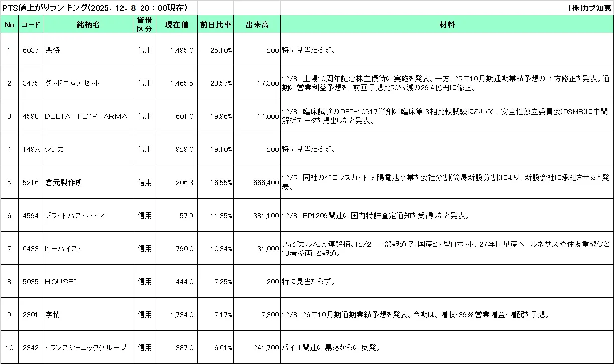 カブ知恵発 PTS値上がりTOP10(2025/12/8)