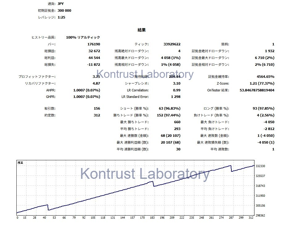 EURUSD用のEA(MT5用)の過去約一年のバックテストの検証結果です