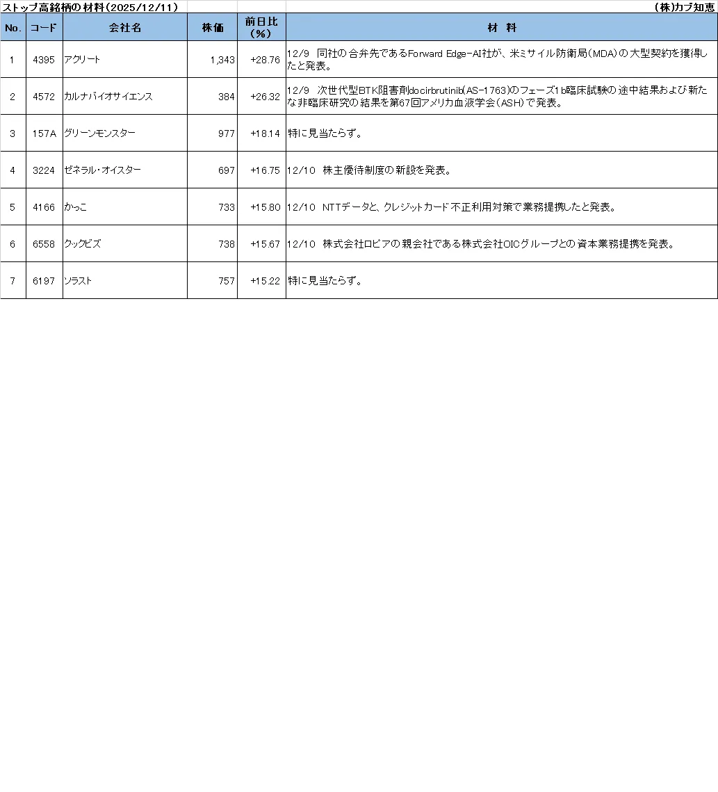 カブ知恵発 ストップ高銘柄の材料(2025/12/11)