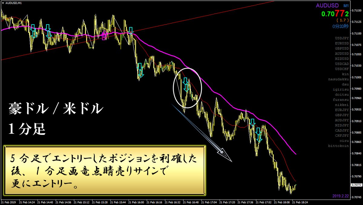 ラインを抜けきった後の画竜点睛の1分足買いサインでエントリー。