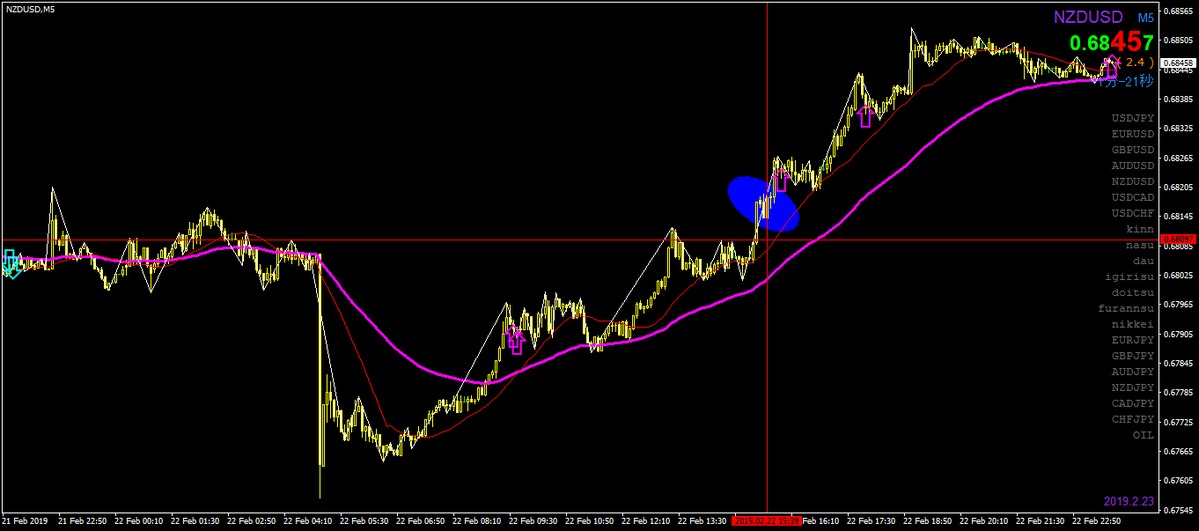 5分足で見ると長陰線を付ける前の戻し高値ラインをブレイクしているのがわかります。