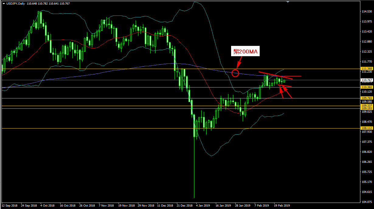 ドル円の日足チャートから見てみます。ドル円日足では、機関投資家も注目する唯一強力な壁として機能するとされる紫200MAのレジスタンスラインとドル円110.360円のサポートラインに挟まれレンジ状態が継続されています。一週間前の巨大陰線以降ローソクの高値が徐々に切り下がってきており、また1本前のローソクに至っては更にその1本前のローソクの安値も切り下げている事からほぼ上値が重い状況と予想されます。