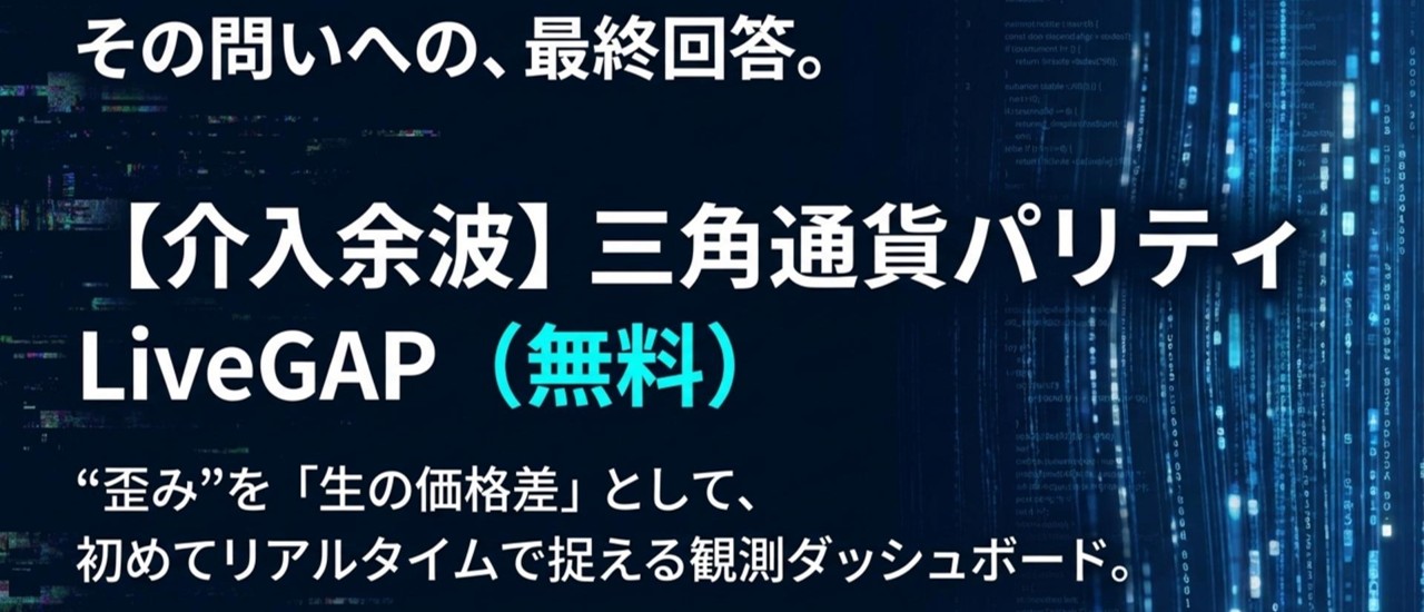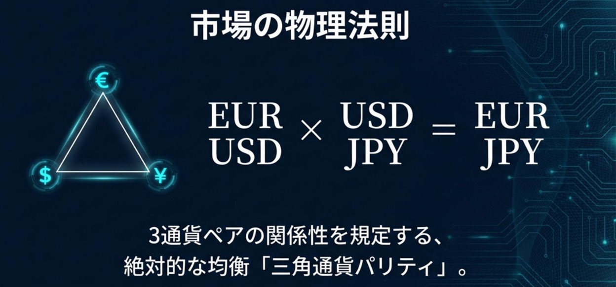 前回までの記事では、FX市場に存在する「三角通貨パリティ(Triangular Parity)」という“相場の物理法則”と、その法則が崩れた瞬間に生じる歪み(Distortion)を、裁定ロジックと統計的な視点で読み解いてきました。