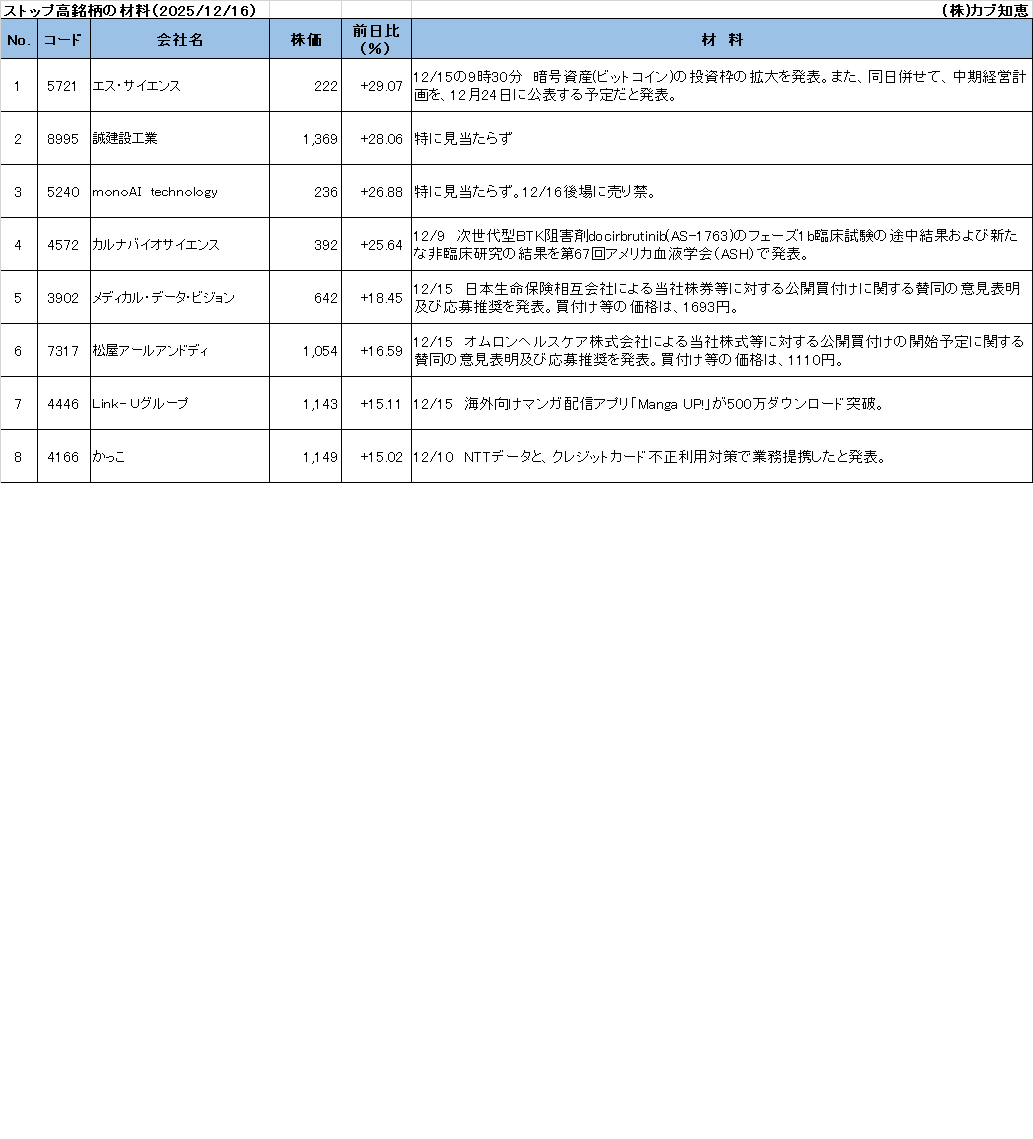 カブ知恵発 ストップ高銘柄の材料(2025/12/16)