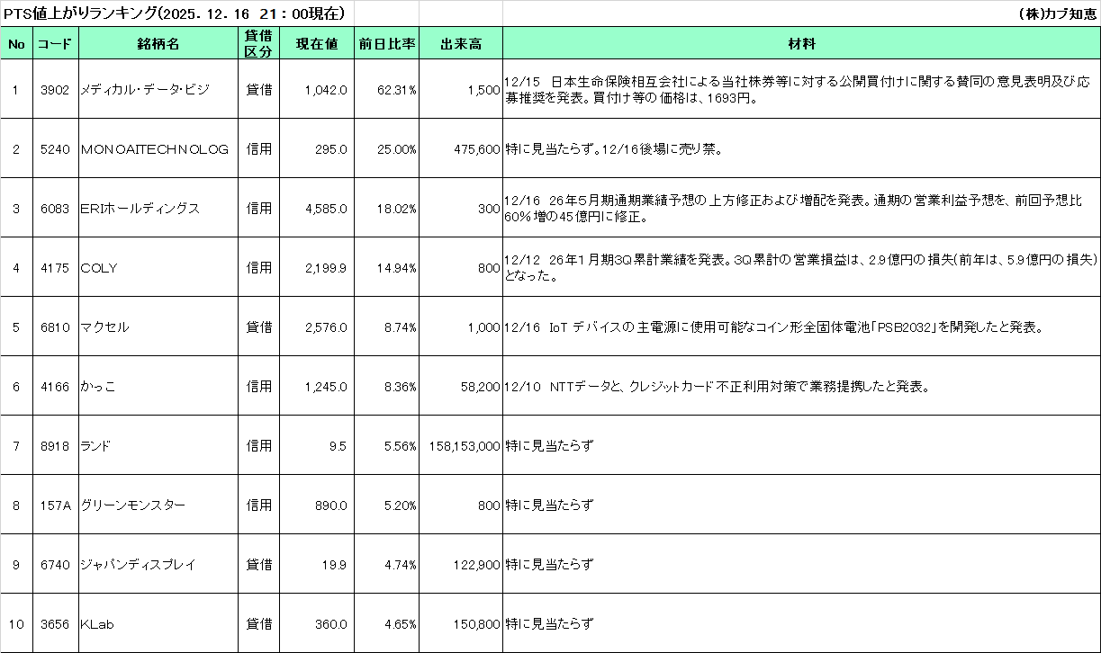 カブ知恵発 PTS値上がりTOP10(2025/12/16)