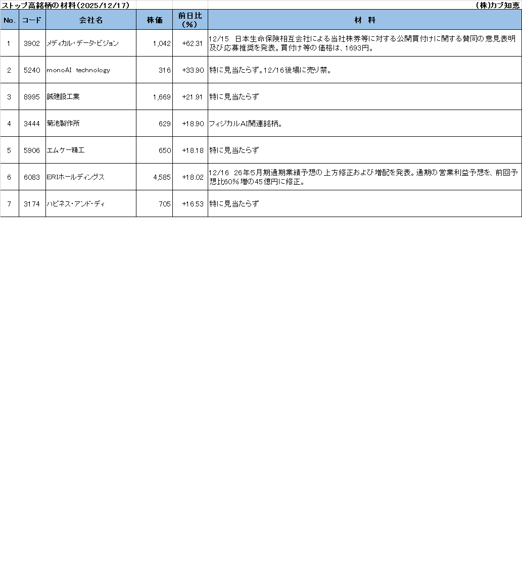 カブ知恵発 ストップ高銘柄の材料(2025/12/17)