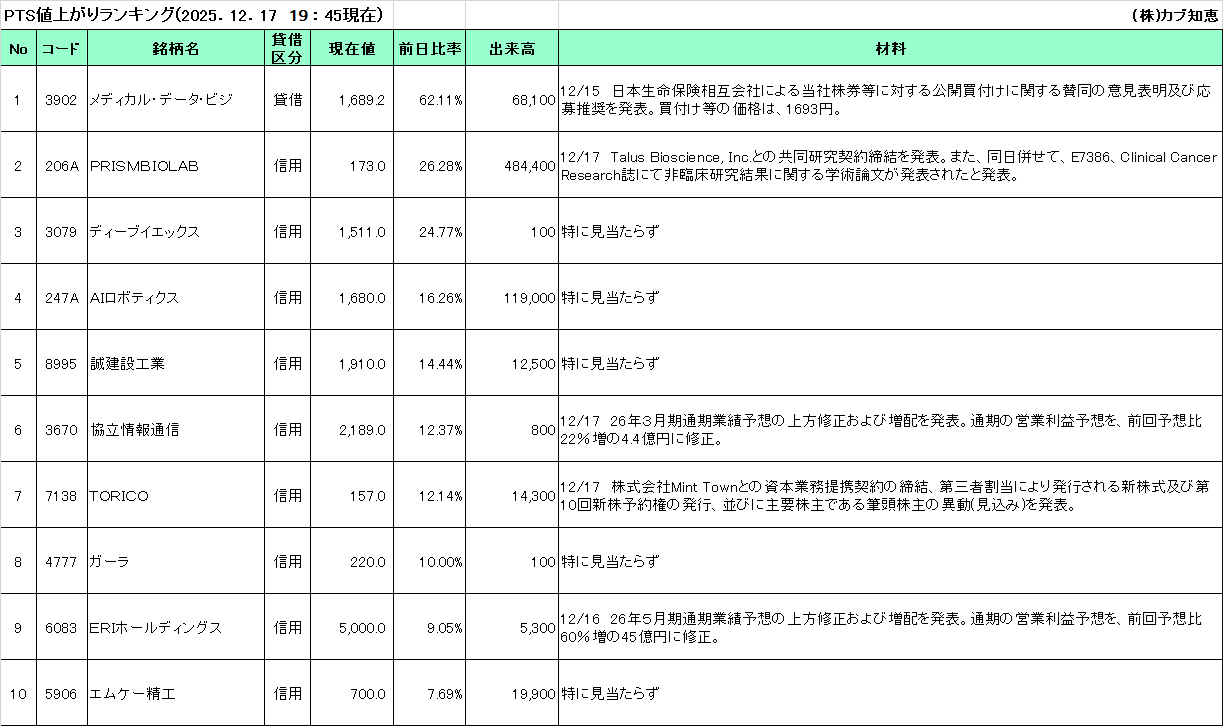 カブ知恵発 PTS値上がりTOP10(2025/12/17)