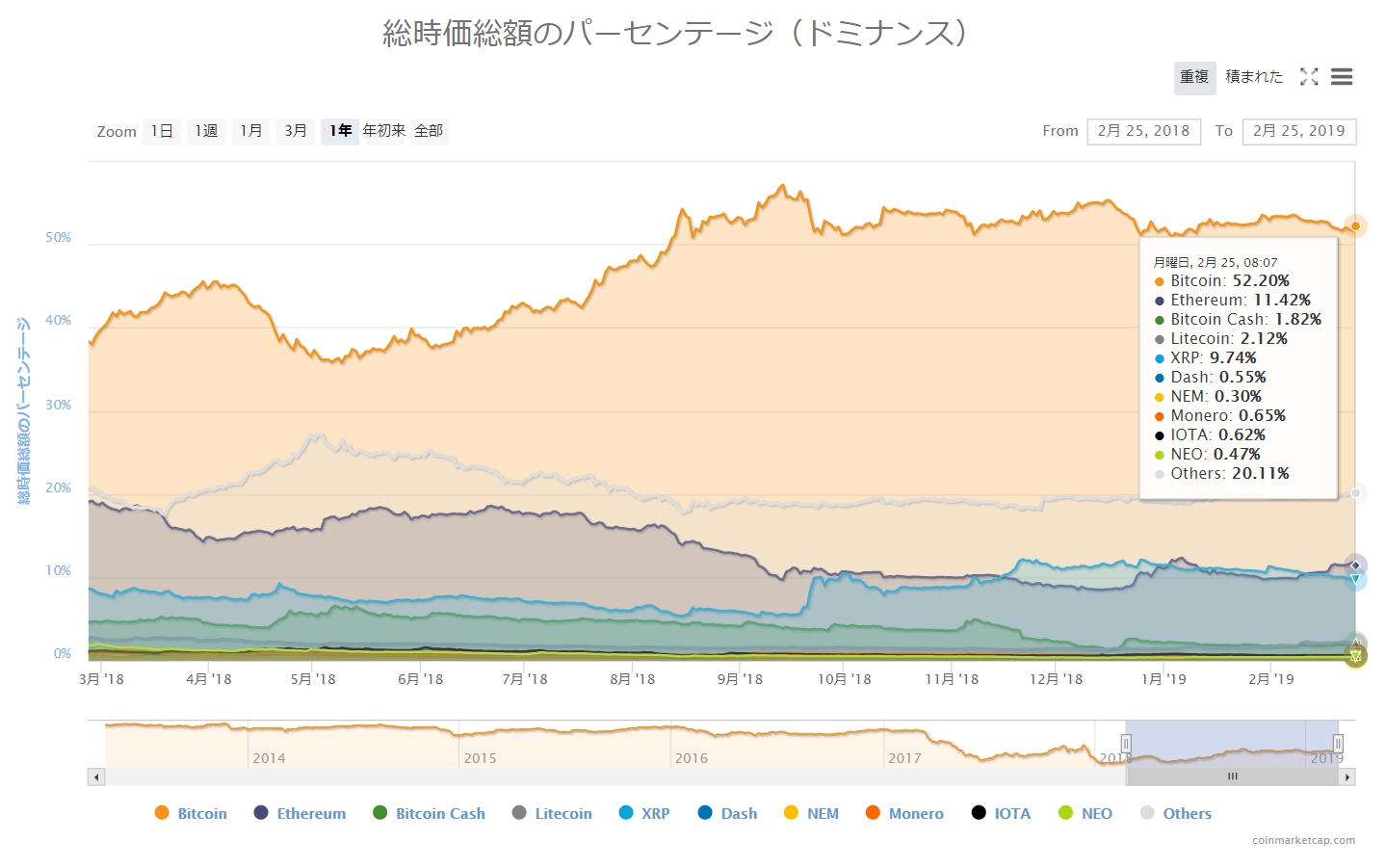 画像は2019年2月25日のキャプチャ。昨日は「真紅」に染まり、主要どころは8~16%の下落となっていました。それに対して今日は、いくらかは回復の「緑」に。主要どころは1~8%の回復となっています(8%の回復はリップル)。