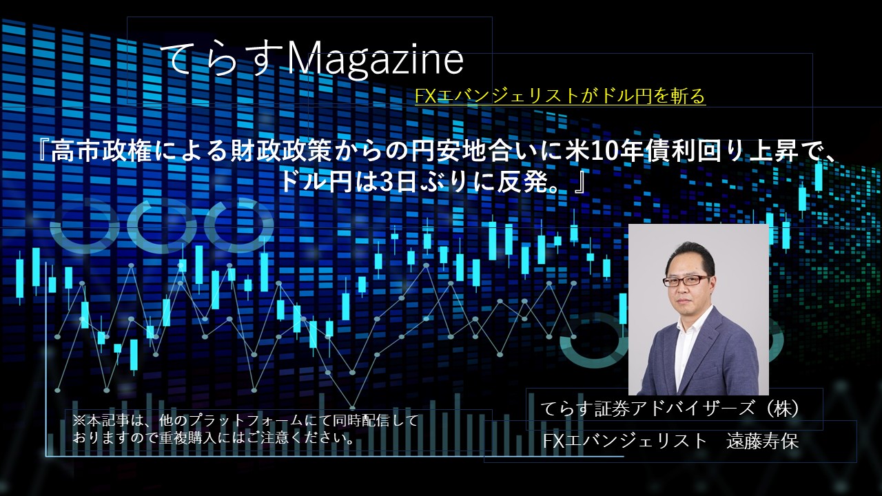 高市政権による財政政策からの円安地合いに米10年債利回り上昇で、ドル円は3日ぶりに反発。
