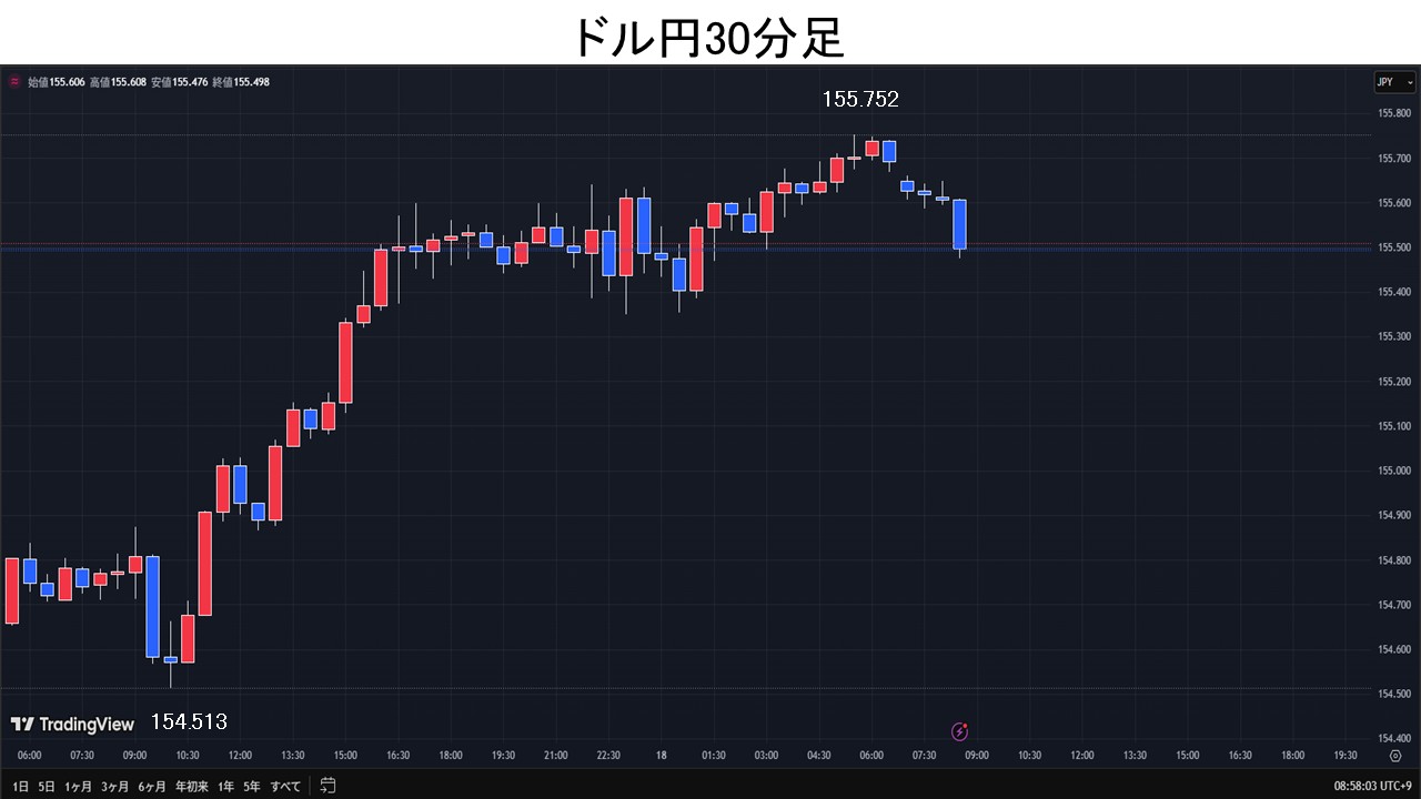 東京時間、ドル円は仲値におけるドル売り観測で154.51円まで下押しとなるが、その後は日経平均の上昇などを受け155.40円まで上昇。欧州時間、ドル円は155円台半ばで揉み合い。NY時間、米10年債利回りの上昇を受け、ドル円は155.64円まで上昇。その後、米10年債利回りが上昇幅を縮小させると、ドル円は155円台前半まで下押し。しかし、高市政権の積極財政による財政悪化懸念からの円売りの流れで、ドル円は155.75円まで上昇と3日ぶりの反発となった。