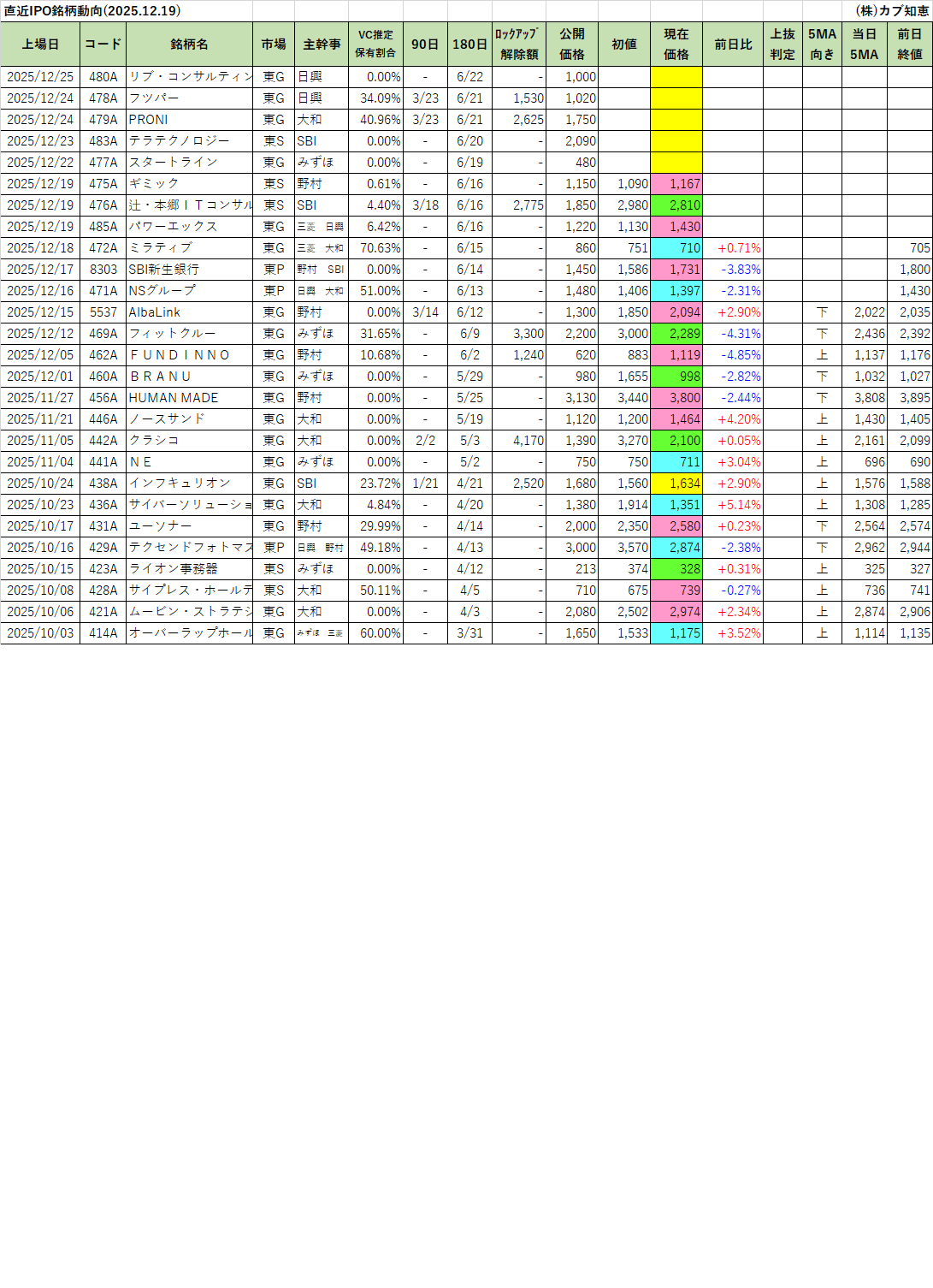 カブ知恵発 直近IPO銘柄動向(2025/12/19)