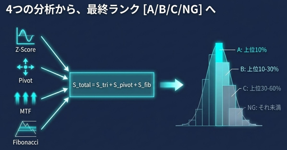 NOWCASTは Z-score / Pivot / MTF / Fibonacci の4分析を合成し、スコア分布から A/B/C/NG を直感的に判定します。