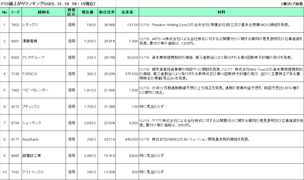 カブ知恵発 PTS値上がりTOP10(2025/12/19)