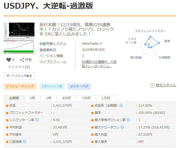 USDJPY、大逆転-過激版 - システムトレード - 世界のトレード手法・ツールが集まるマーケットプレイス - GogoJungle