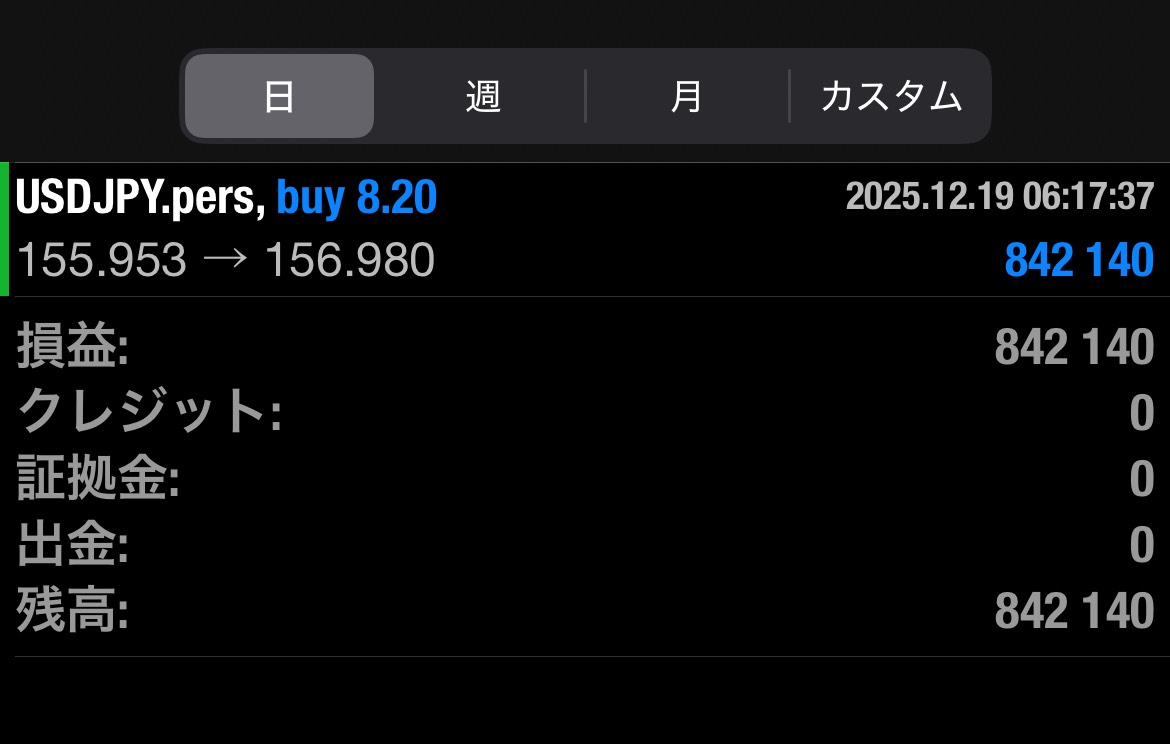 今回のトレードは市場の大きな変化を事前に捉えることができた理想的なトレードでした。損切設定は約20pips、リスク値は3%で設定していたのでLot数は8.20でした(損失はいつも通り一定のリスク)。
