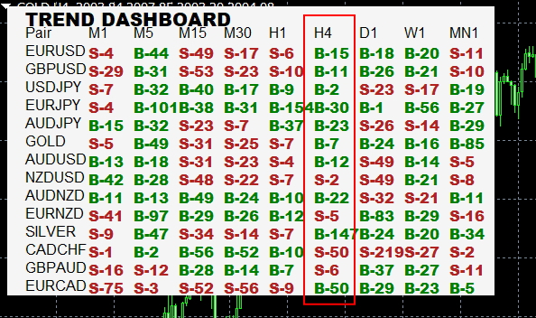 通貨は何個でも表示できます。H4(4時間足)を使用します。H4(4時間足)の列のBは買いサイン、Sは売りサインになります。例えば、B-15でしたら、買いトレンドがH4(4時間足)で、15回継続していることを意味しています。