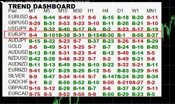 下記の場合、EUR/JPYは、M5からMN1まで全て買いのサインになっています。