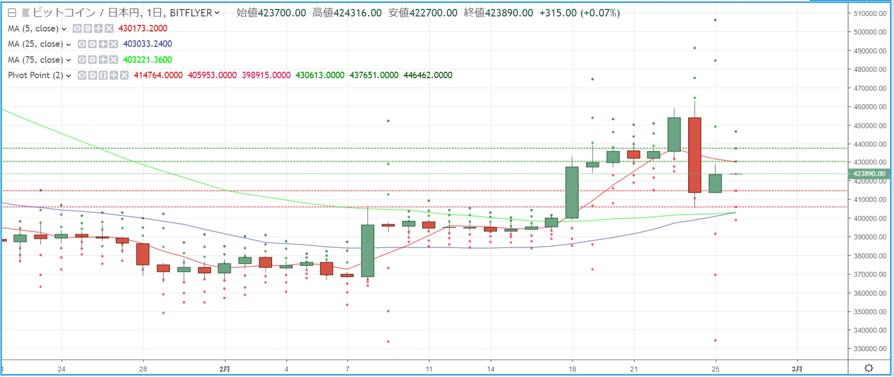 画像は2019年2月26日のキャプチャ。昨日は主要どころ(ビットコイン、ビットコインキャッシュ、イーサリアム、リップル、ライトコイン)が1~8%の回復となっていました。それに対して、今日は全面的に「赤」に転換。主要どころは1~3%の下落です。