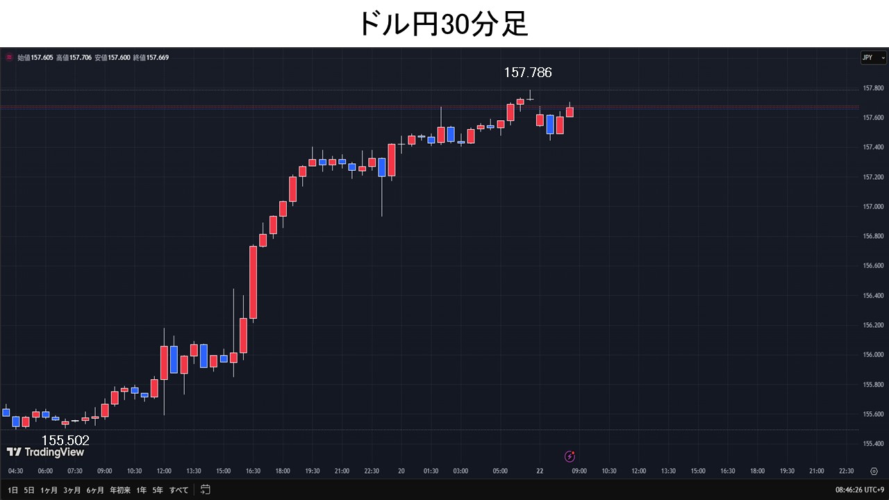 植田日銀総裁の追加利上げに慎重な姿勢受け、ドル円は157円台後半まで上昇。