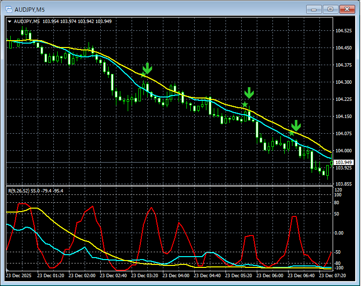 【RCIを極めて移動平均線フィルターで勝つ!!】本日の豪ドル円 5分足 mBDSRのサイン