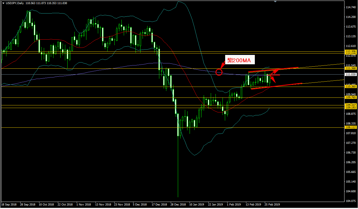 ドル円の日足チャートから見てみます。ドル円日足では、トレーディングレンジのラインが明確に引け上のトレンドラインも下のトレンドラインも割としっかり効いていると予想されます。そんな中機関投資家も注目する移動平均線では唯一強力な壁として機能するとされる紫200MAに再び現値が到達し、ここより上へ抜けるのか下へ弾き返されるのかが注目されます。