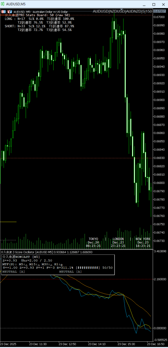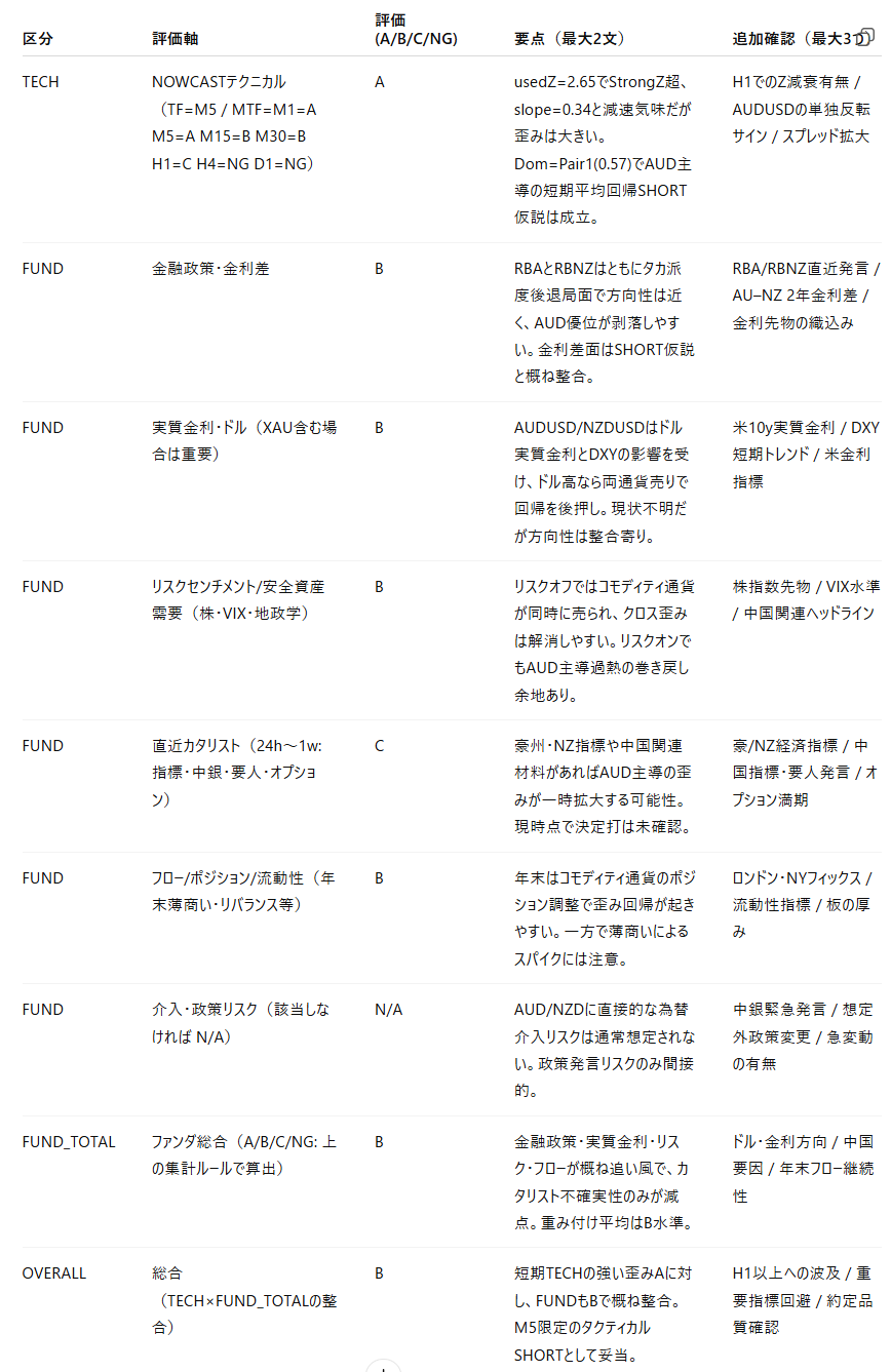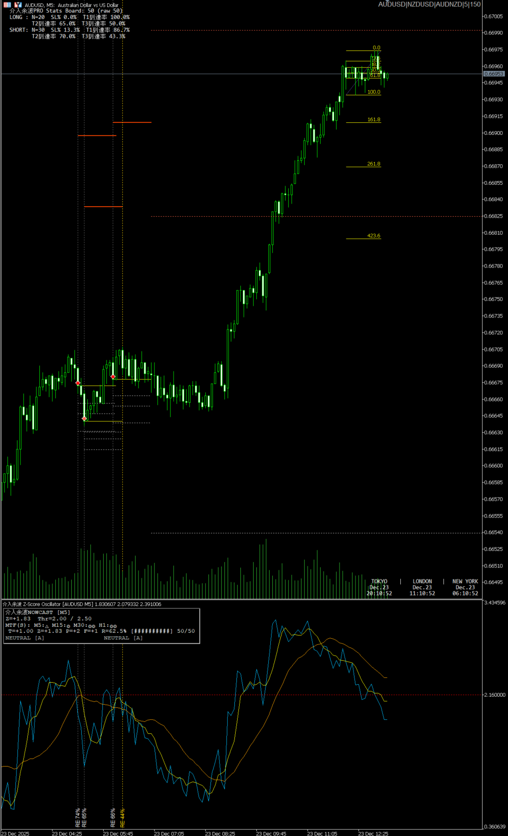 (追加)上のスクショは 2025/12/23 20:10頃に撮影したもので、AUDUSD(5分足)のNOWCASTテクニカル評価は「A」(上記画像①)でした。