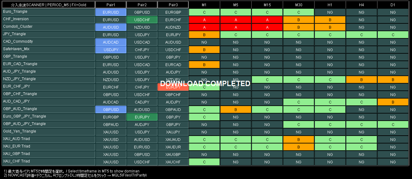 Nowcast搭載Scanner上で、「フォーカスしたいトライアッドセット × 時間足」の NOWCAST評価セルをクリックすると、