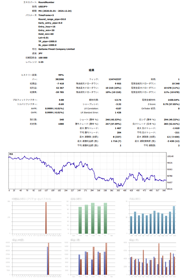 USDJPYで、その時間(有効期限1時間)にラウンドナンバー(1円刻み, 0.5円刻み等)にタッチしたら逆張りし、6年のテストで有効性が確認できたという結果が得られたようです。
