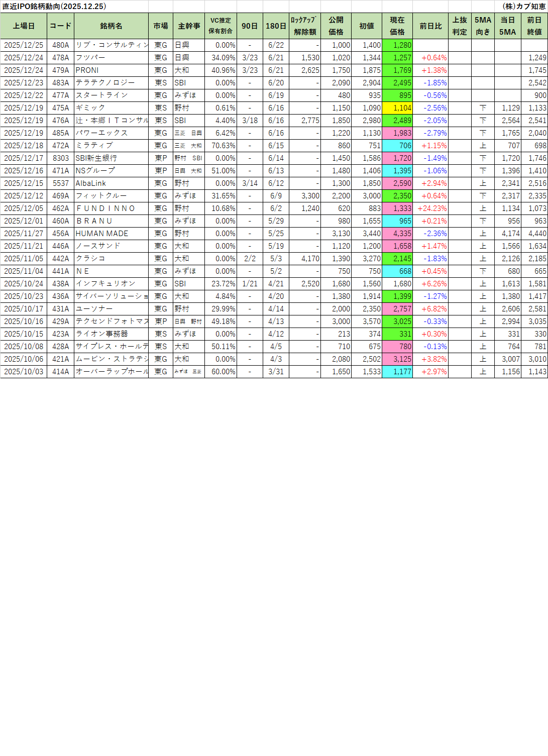 カブ知恵発 直近IPO銘柄動向(2025/12/25)