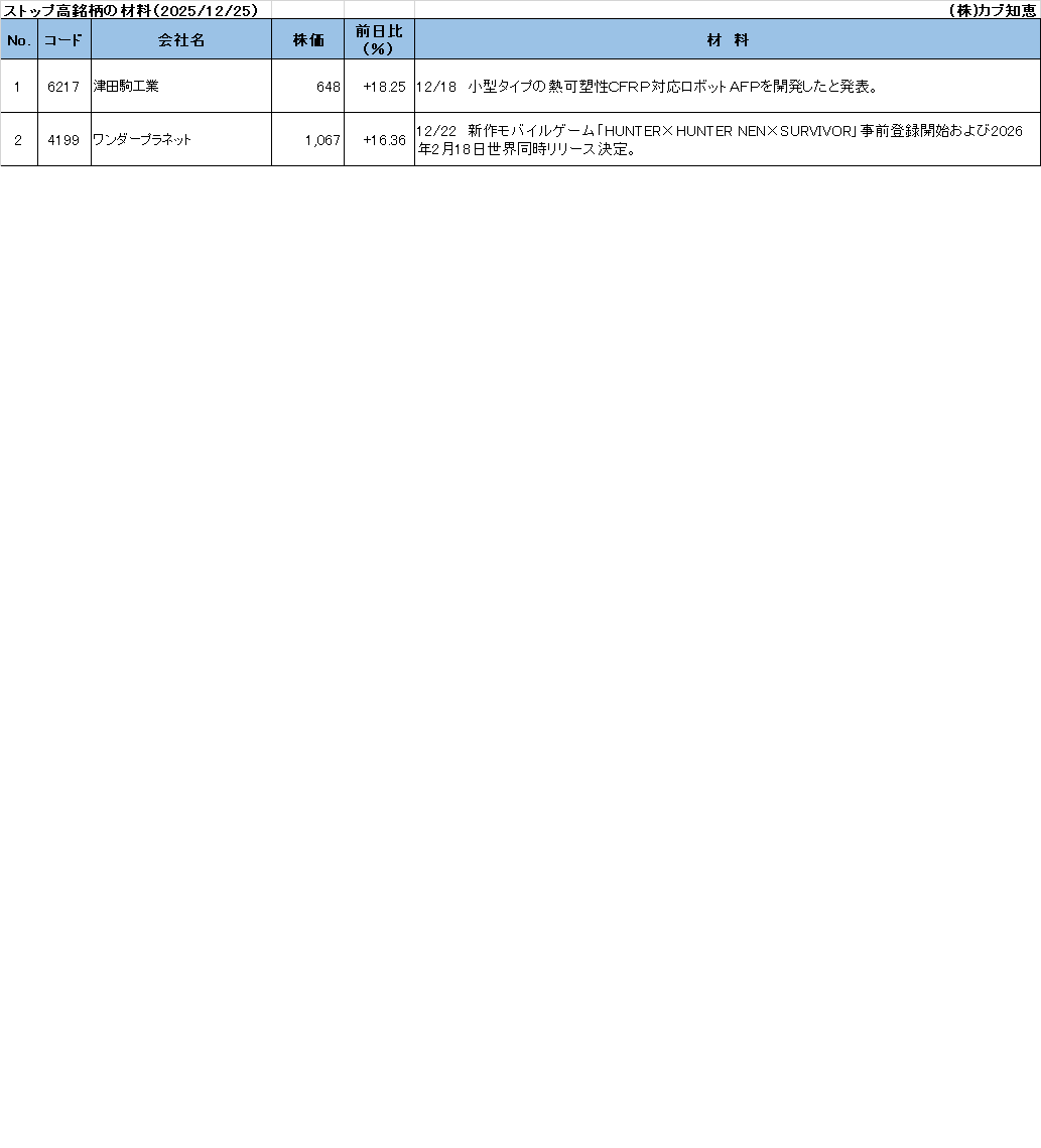 カブ知恵発 ストップ高銘柄の材料(2025/12/25)